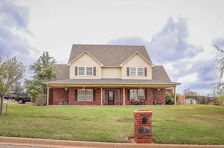 This stunning home, situated on a spacious corner lot, features large dormers and a covered front porch that spans the entire front of the house. It feels welcoming and truly like home. The backyard boasts a large, newly updated SWIMMING POOL, with a pool pump installed last year and a diving board. The expansive, fenced backyard includes trees, a one-year-old storm shelter, and a 1000 sq. ft. covered patio, perfect for entertaining! Inside, you'll be impressed by the high ceilings and open floor plan. The gas fireplace, adorned with newly installed marble tile, serves as a focal point. Numerous updates throughout the house include lighting, faucets, a remodeled bathroom, and bookshelves in the bonus room. The kitchen features granite countertops, stainless steel appliances, an island with a new sink, faucet, and dishwasher, and ample cabinet space. All kitchen appliances are included, along with a recently replaced microwave, a breakfast nook, and a formal dining room. The master bedroom has a private door to the patio and a spacious master bath with a walk-in shower, soaking tub, walk-in closet, and double vanity. The second bedroom and bathroom are also on the main floor. Upstairs, you'll find two more bedrooms, a third full bath, and a large BONUS room. This beautiful, spacious home is perfect for entertaining. Located on a lovely corner lot with apple trees lining the fence and a two-car garage, all within the charming Quail Ridge addition.